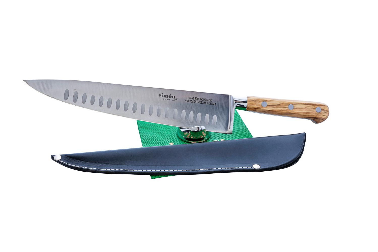 Cuchillo cebollero Simón PRO Olivo tamaño oficial de 25cm de hoja muy robusto y perfectamente equilibrado, para picar verdura y cortar huesos de ave y afilado a mano con piedra de cerámica al agua, funda piel flor negra cosida incluida.